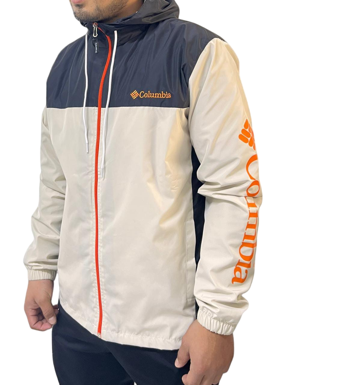 Casaca Columbia con capucha impermeable con malla de algodón interno.